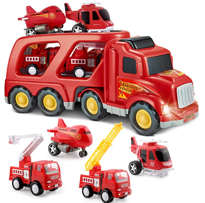 It’s a 5 piece toy set, this fire truck toy set includes a 1 large transport fire truck, 2 rescue trucks, 1 airplane, 1 helicopter, these fire truck toys will bring lots of joy and fun to the kids. This fire truck toy is in the unique design with movable functional parts for a realistic look. Your kids can play with real lights & sound effects with this toy by pressing the button above the truck to play the sound & turn on the light, which adds to the realistic play and these look like real things. When you push this large truck, it can move to a long distance due to the inertia wheels.