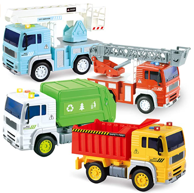 This is a 4 in 1 friction powered city vehicle, includes 1 garbage truck, 1 fire engine truck, 1 boom lift truck, and 1 construction dump truck. All the vehicles have a feature of lights and making noises for a specific amount of time, like real vehicles. Each of the trucks will have their unique parts, which are functional. All these trucks are friction powered, these will roll on their own with pushing for a long distance on smooth surfaces.